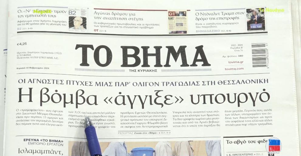 ΕλλάδαΤα πρωτοσέλιδα των εφημερίδων σήμερα 18 Φεβρουαρίου 2024FacebookTwitterPinterestWhatsApp Πηγή Παρόμοια άρθραΠερισσότερα απο τον δημιουργόΦρίκη στη Θεσσαλονίκη: 90χρονος ακινητοποίησε σκύλο με χαρτοταινία και τον έθαψε ζωντανό13 νέα Πειραματικά Σχολεία θα λειτουργήσουν μέχρι το 2028 – Ποιες περιοχές αφορούνΟδηγίες για τους Έλληνες γονείς μετά την αποκάλυψη για το σπέρμα Δανού δότη με γονίδιο καρκίνου – 18 τα παιδιά στην Ελλάδα