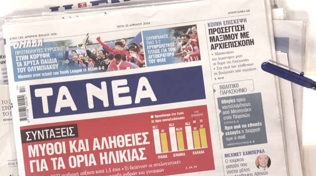 ΕλλάδαΤα πρωτοσέλιδα των εφημερίδων σήμερα 23 Απριλίου 2024FacebookTwitterPinterestWhatsApp Πηγή Παρόμοια άρθραΠερισσότερα απο τον δημιουργόΚρήτη: Νεκρός ο 40χρονος που είχε εγκλωβιστεί στο φαράγγι του Αμπά – «Μπορεί να ζούσε εάν είχε έρθει το ελικόπτερο από την αρχή»Έλενα Παπαρίζου: Ο Κωστής Μαραβέγιας την αντικαθιστά στα σημερινά γυρίσματα του «The Voice of Greece»Αμετακίνητοι στα μπλόκα οι αγρότες: Τι ζητούν από την κυβέρνηση για να ανοίξουν τους δρόμους – Συλλήψεις για τα σοβαρά επεισόδια στην Κρήτη