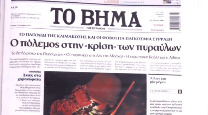 ΕλλάδαΤα πρωτοσέλιδα των εφημερίδων σήμερα 24 Νοεμβρίου 2024FacebookTwitterPinterestWhatsApp Πηγή Παρόμοια άρθραΠερισσότερα απο τον δημιουργόΚρήτη: Συγκλονίζουν οι μαρτυρίες των 2 διασωθέντων από το ναυάγιο με τους 17 νεκρούς μετανάστες – Μίλησαν για 34 συνολικά επιβαίνοντεςΕκτός ελέγχου η κατάσταση στα μπλόκα: Άγρια επεισόδια στην Κρήτη με μάχες σώμα με σώμα αγροτών και ΜΑΤ – Κλειστό το αεροδρόμιο ΗρακλείουΌμιλος Fourlis: Μια ιστορία που ξεκίνησε από ένα κατάστημα και έφτασε να διαμορφώνει το μέλλον του retail