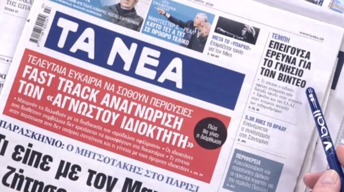 Αρχική Ελλάδα Τα πρωτοσέλιδα των εφημερίδων σήμερα ΕλλάδαΤα πρωτοσέλιδα των εφημερίδων σήμερα 11 Φεβρουαρίου 2025FacebookTwitterPinterestWhatsApp Πηγή Παρόμοια άρθραΠερισσότερα απο τον δημιουργόΈμπειρος ορειβάτης από την Ηλεία μεταξύ των τεσσάρων νεκρών από τη χιονοστιβάδα στα Βαρδούσια Όρη – Τελευταία στιγμή δεν πήγε μαζί τους και πέμπτοςΚαιρός – Άγιος Δημήτριος: Η στιγμή που σκύλος σώζεται τελευταία στιγμή από την κατάρρευση αυλήςΣέρρες: Βρέθηκε αυτοκίνητο που μοιάζει με του διοικητή της πυροσβεστικής των Άνω Ποροΐωντελευταία άρθραDavid & Victoria Beckham: Ένας χριστουγεννιάτικος χορός γεμάτος συναισθήματα και κρυφά... 27 Δεκεμβρίου 2025Ο Βαγγέλης Μαρινάκης θα τιμήσει τη μνήμη του Τζον Ρόμπερτσον, θρύλου... 27 Δεκεμβρίου 2025Βίρτους Μπολόνια – Ολυμπιακός 94-97: Νίκησαν οι Πειραιώτες παρά τις αυτοκτονικές... 27 Δεκεμβρίου 2025Jennifer Aniston: Τα πρώτα Χριστούγεννα με τον Jim Curtis και οι... 27 Δεκεμβρίου 2025Η βαθμολογία της Euroleague μετά την αγχωτική νίκη του Ολυμπιακού στην... 27 Δεκεμβρίου 2025Γιώργος Γεροντιδάκης: Ο έρωτας, οι χωρισμοί και η αλήθεια πίσω από... 27 Δεκεμβρίου 2025