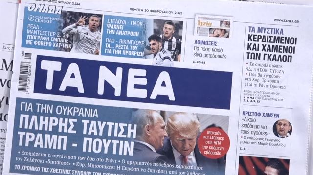 Αρχική Ελλάδα Τα πρωτοσέλιδα των εφημερίδων σήμερα ΕλλάδαΤα πρωτοσέλιδα των εφημερίδων σήμερα 20 Φεβρουαρίου 2025FacebookTwitterPinterestWhatsApp Πηγή Παρόμοια άρθραΠερισσότερα απο τον δημιουργόΚαιρός σήμερα: Τοπικές βροχές σε Κρήτη, Ήπειρο και Εύβοια – Ισχυροί άνεμοι έως 9 μποφόρ στο ΑιγαίοΦλώρινα: Απάντηση της Banda Entopica για τη διακοπή συναυλίας – «Παίξαμε το ”Σόφκα” και το ”Έλα Κέρκο” και όχι το ”Eleno Kerko”»Ivan Greko: Συνελήφθη ο τράπερ μέσα σε κλεμμένο αυτοκίνητοτελευταία άρθραΚολοσσός – Μύκονος Betsson 83-97: Πήρε το νησιωτικό ντέρμπι της BCL... 28 Δεκεμβρίου 2025Καιρός σήμερα: Τοπικές βροχές σε Κρήτη, Ήπειρο και Εύβοια – Ισχυροί... 28 Δεκεμβρίου 2025Άρσεναλ – Μπράιτον 2-1: Δεν το κουνάει από την κορυφή της... 28 Δεκεμβρίου 2025Λίβερπουλ – Γουλβς 2-1: Έπιασαν τετράδα στην Premier League οι «ρεντς»,... 28 Δεκεμβρίου 2025Copa Africa: Πρώτη ιστορική νίκη για το Μπενίν, σκόραρε ο Μπακαμπού... 28 Δεκεμβρίου 2025Νίκος Αλιάγας: Χόρεψε τσάμικο στη Γαλλική tv με Guest τον Ρέμο... 28 Δεκεμβρίου 2025
