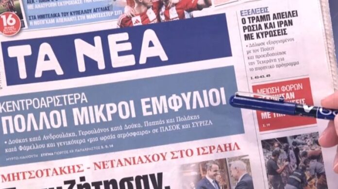 Αρχική Ελλάδα Τα πρωτοσέλιδα των εφημερίδων σήμερα ΕλλάδαΤα πρωτοσέλιδα των εφημερίδων σήμερα 31 Μαρτίου 2025FacebookTwitterPinterestWhatsApp Τι γράφουν οι εφημερίδες σήμερα 31/03/2025. Πηγή Παρόμοια άρθραΠερισσότερα απο τον δημιουργόΤζόκερ κλήρωση 3009: Οι τυχεροί αριθμοί σήμεραΠάτρα: Η στιγμή που τρεις νεαροί αρπάζουν χρήματα από παιδιά που έλεγαν τα κάλανταΟι αγρότες έκαναν ρεβεγιόν στο μπλόκο της Νίκαιας: Έκοψαν τη βασιλόπιτα πάνω στο τρακτέρ – «Δεν κάνουμε βήμα πίσω»τελευταία άρθραΤζόκερ κλήρωση 3009: Οι τυχεροί αριθμοί σήμερα 1 Ιανουαρίου 2026ΗΠΑ: Η ευχή του Τραμπ για το 2026 και η εντυπωσιακή... 1 Ιανουαρίου 2026Τανιμανίδης: Ο απίθανος και τρυφερός λόγος που η κόρη του η... 1 Ιανουαρίου 2026Πάτρα: Η στιγμή που τρεις νεαροί αρπάζουν χρήματα από παιδιά που... 1 Ιανουαρίου 2026ΠΑΟΚ: Η πρώτη προπόνηση του Αλεξάντερ Γερεμέγιεφ με τους Θεσσαλονικείς 1 Ιανουαρίου 2026Οι αγρότες έκαναν ρεβεγιόν στο μπλόκο της Νίκαιας: Έκοψαν τη βασιλόπιτα... 1 Ιανουαρίου 2026