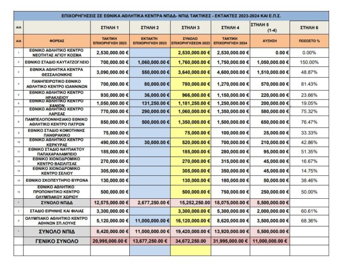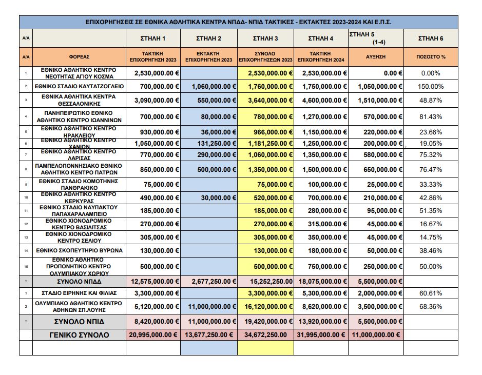 Μεγάλες αυξήσεις στις χρηματοδοτήσεις των Εθνικών Αθλητικών Κέντρων – Έκτακτη επιδότηση στο ΟΑΚΑ για νέες υποδομές – Θέσπιση συντελεστών νησιωτικότητας και συνέπειας στην καταβολή των πόρων