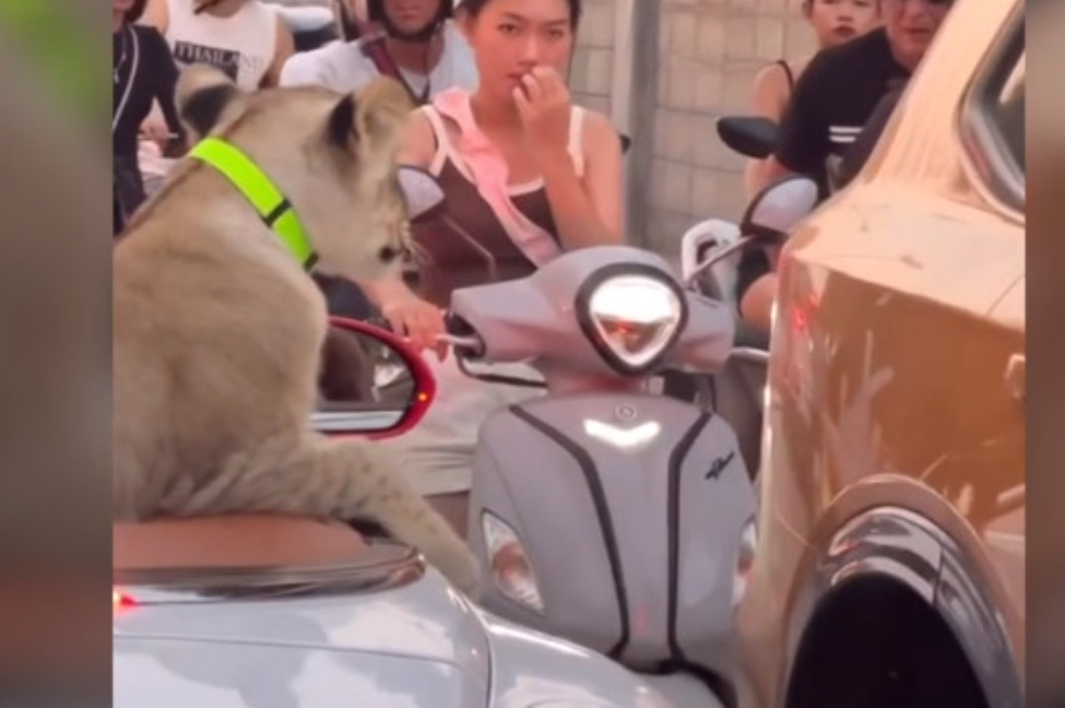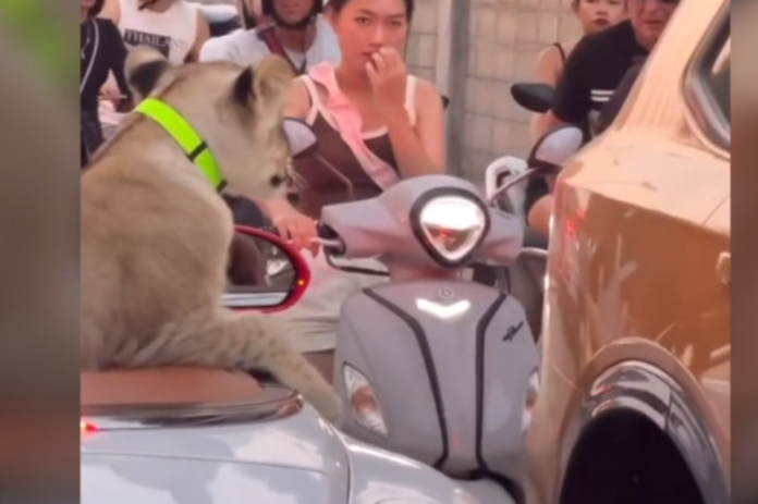 Η γυναίκα εθεάθη να κάνει βόλτες στους δρόμους της Πατάγια με τη λέαινα, η οποία ήταν δεμένη στο πίσω μέρος μίας κάμπριο Bentley.