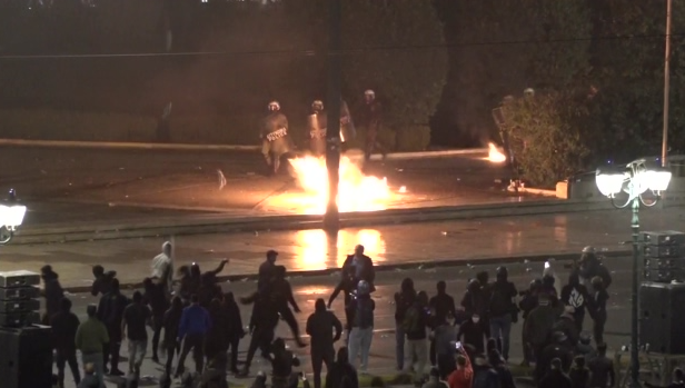 Το Σύνταγμα και οι γύρω δρόμοι για περίπου μισή ώρα μετατρέπονται σε πεδίο μάχης. Η ένταση γρήγορα μεταφέρεται στην Πανεπιστημίου.