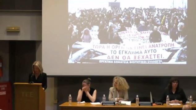 Η Μαρία Καρυστιανού, μητέρα της 19χρονης Μάρθης που έχασε την ζωή της στην τραγωδία των Τεμπών, δέχεται το θερμό χειροκρότημα όσων κατέκλυσαν την αίθουσα του Πανεπιστημίου Βόλου. Ζήτησε ξανά δικαίωση, για τις 57 ψυχές που έσβησαν εκείνο το βράδυ.