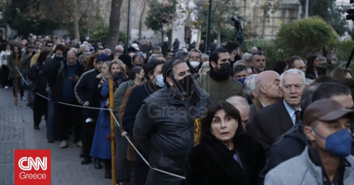 Μετά τις 7:00 το πρωί της Δευτέρας, πλήθος κόσμου είχε συγκεντρωθεί στην είσοδο της Μητρόπολης καλύπτοντας τον χώρο ενώ εξακολουθεί και φτάνει κόσμος στο σημείο σχηματίζοντας μεγάλη ουρά.