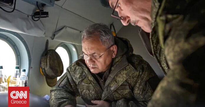 Η υπηρεσία Τύπου του ρωσικού υπουργείου Άμυνας έδωσε στη δημοσιότητα φωτογραφία, στην οποία απεικονίζεται ο Ρώσος υπουργός Άμυνας Σεργκέι Σόιγκου να κοιτάζει μέσα από το παράθυρο ενός στρατιωτικού ελικοπτέρου καθώς επιθεωρεί τα ρωσικά στρατεύματα σε άγνωστη τοποθεσία στην Ουκρανία.