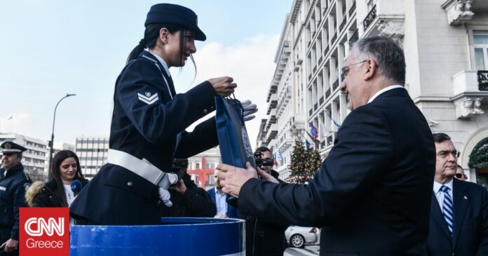 «Τηρήσαμε και φέτος το πατροπαράδοτο έθιμο, προσφέροντας ένα συμβολικό δώρο στην τροχονόμο που ρυθμίζει την κυκλοφορία στην πλατεία Συντάγματος και στο πρόσωπο της, λέμε ένα μεγάλο ευχαριστώ σε όλες τις γυναίκες και τους άνδρες που υπηρετούν στην Ελληνική Αστυνομία, αγωνίζονται νυχθημερόν, πολλές φορές σε πολύ δύσκολες συνθήκες, για να προσφέρουν στους πολίτες ασφάλεια στην πατρίδα μας, τους ευχαριστούμε. Χρόνια πολλά, καλή χρονιά στους άνδρες και στις γυναίκες της Ελληνικής Αστυνομίας. Καλή χρονιά σε όλους τους Έλληνες», τόνισε ο κ. Θεοδωρικάκος.