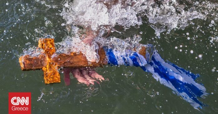 Ο ιερέας ρίχνει τον Σταυρό στη θάλασσα ή στο ποτάμι (όπου δεν υπάρχουν, αγιάζονται δεξαμενές με νερό, όπως στην Αθήνα), κατά μίμηση της Βάπτισης του Θεανθρώπου. Οι νέοι πέφτουν για να τον πιάσουν, ενώ θεωρείται ευλογία για εκείνον που θα τον πιάσει και την οικογένειά του.