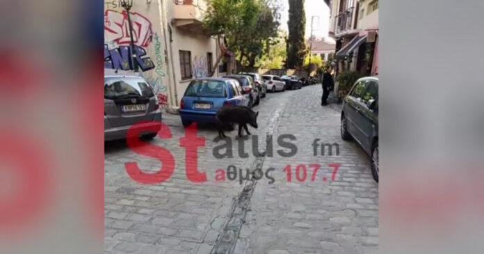 Σε βίντεο που δημοσιεύτηκαν στα social media φαίνονται το αγριογούρουνο να κόβει βόλτες σε πλακόστρωτο στην Άνω Πόλης της Θεσσαλονίκης, χωρίς να ενοχλείται στιγμή από τις φωνές των παιδιών και την παρουσία των περαστικών.