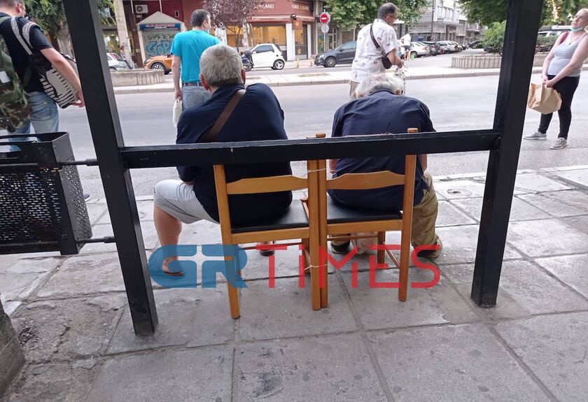 Ευρηματικοί φαίνεται πως είναι οι κάτοικοι της Θεσσαλονίκης, καθώς σε μια στάση λεωφορείου, όπου ο δήμος δεν έχει βάλει παγκάκι, τοποθέτησαν ξύλινες καρέκλες για να κάθεται ο κόσμος που περιμένει.