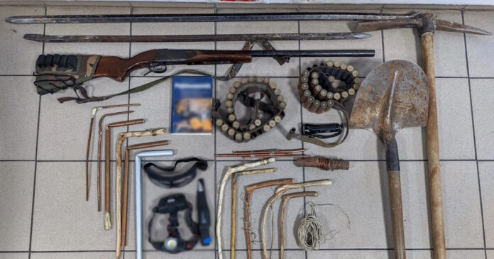 Σε έρευνες που έγιναν στον χώρο, σε σπίτια των κατηγορουμένων, όπως και σε σωματικές έρευνες, βρέθηκαν και κατασχέθηκαν φτυάρι, αξίνα και δύο μεταλλικοί λοστοί, κυνηγετική καραμπίνα με 50 φυσίγγια και μαχαίρι, αυτοσχέδιες ξύλινες και μεταλλικές ράβδοι διασκόπησης υπεδάφους, φακός κεφαλής, φακός, καλώδια, ζεύγος προστατευτικών γυαλιών εργασίας και βιβλίο ραβδοσκοπίας.