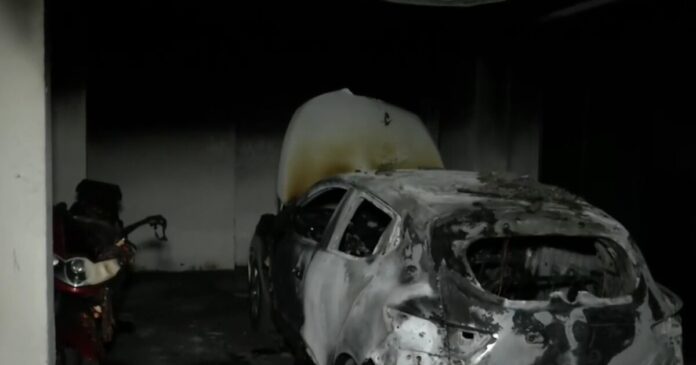 Το αυτοκίνητο κάηκε ολοσχερώς ενώ η φωτιά επεκτάθηκε και σε δύο δίκυκλα εντός της πιλοτής.