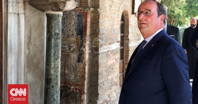 Έπειτα από πρόταση της γενικής προξένου της Γαλλίας στη Θεσσαλονίκη και διευθύντριας του Γαλλικού Ινστιτούτου Σαντρίν Μουσέ, ο κ. Ολάντ επισκέφθηκε τη Μονή Βλατάδων, όπου ξεναγήθηκε από τη Φλώρα Καραγιάννη, διευθύντρια στο Ευρωπαϊκό Κέντρο Βυζαντινών και Μεταβυζαντινών Μνημείων και τμηματάρχη Βυζαντινών και Μεταβυζαντινών Αρχαιοτήτων και Μουσείων στην Εφορεία Αρχαιοτήτων Πόλης Θεσσαλονίκης.