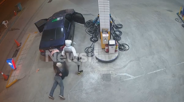 Ο ένας ανοίγει την πόρτα του αυτοκινήτου και φαίνεται να λέει στον υπάλληλο να γεμίσει το ντεπόζιτο. Μόλις ο υπάλληλος κάνει τη δουλειά του, οι δύο δράστες βγαίνουν από το αυτοκίνητο και κινούνται απειλητικά προς τον 62χρονο, τον ξυλοφορτώνουν και τον ρίχνουν κάτω.