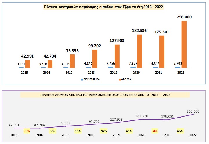 Σε ό,τι αφορά στην προστασία των συνόρων στον Έβρο το 2022 έγιναν 256.060 αποτροπές και 1.491 συλλήψεις διακινητών.