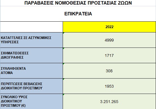 Για την προστασία των ζώων έγιναν 4.999 έλεγχοι, σχηματίστηκαν 1717 δικογραφίες, σημειώθηκαν 308 συλλήψεις, βεβαιώθηκαν 1953 διοικητικά πρόστιμα συνολικού ύψους 3.251.265 ευρώ.