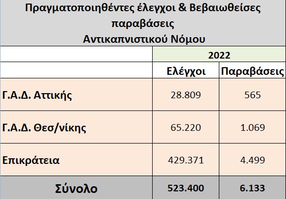 Το 2022 έγιναν 523.400 έλεγχοι για την εφαρμογή της αντικαπνιστικής νομοθεσίας και βεβαιώθηκαν 6.133 παραβάσεις.