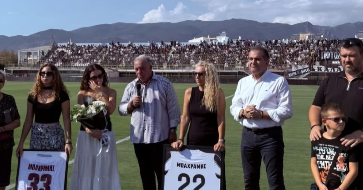 Η οικογένεια του αδικοχαμένου Παναγιώτη Μπαχράμη εμφανίστηκε στον αγωνιστικό χώρο του γηπέδου της Καλαμάτας και δέχθηκε από τις δυο ομάδες τις φανέλες που είχε φορέσει σε αυτές ο αδικοχαμένος ποδοσφαιριστής.