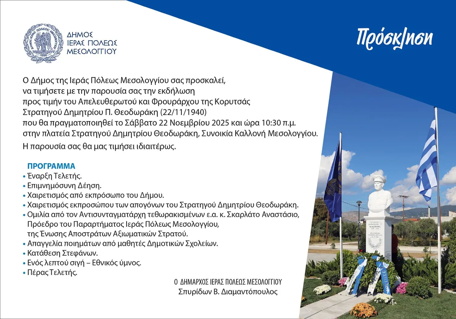 Ο Δήμος Ιερής Πόλης Μεσολογγίου σας προσκαλεί να τιμήσετε με την παρουσία σας την εκδήλωση προς τιμήν του Απελευθερωτή και Φρουράρχου της Κορυτσάς, Στρατηγού Δημητρίου Π. Θεοδωράκη (22/11/1940), που θα πραγματοποιηθεί το Σάββατο, 22 Νοεμβρίου 2025 και ώρα 10:30 π.μ. στην πλατεία Στρατηγού Δημητρίου Θεοδωράκη, Συνοικία Καλλονή Μεσολογγίου.