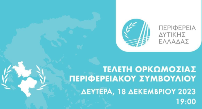 Την Δευτέρα 18 Δεκεμβρίου 2023, θα τελεστεί η ορκωμοσία του Περιφερειάρχη Δυτικής Ελλάδας Νεκτάριου Φαρμάκη και των περιφερειακών συμβούλων που εξελέγησαν στις περιφερειακές εκλογές της 8ης Οκτωβρίου.
