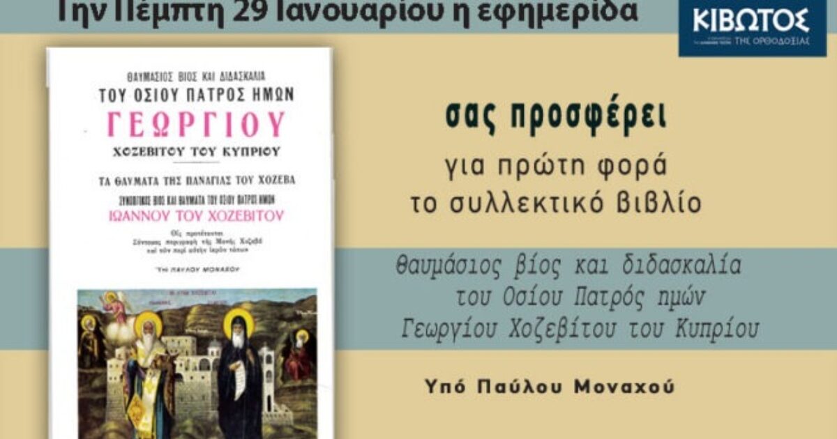 Η εφημερίδα Κιβωτός της Ορθοδοξίας κυκλοφορεί την Πέμπτη 29 Ιανουαρίου και σας προσφέρει για πρώτη φορά το συλλεκτικό βιβλίο «Θαυμάσιος Βίος και Διδασκαλία του Οσίου πατρός ημών Γεωργίου Χοζεβίτου του Κυπρίου».