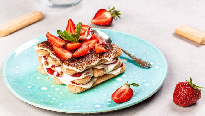 Για τη συναρμολόγηση, βουτήξτε γρήγορα κάθε μπισκότο σαβουαγιάρ στη ζεστή σάλτσα φράουλας και τοποθετήστε το σε μία στρώση στη βάση ενός πυρέξ. Απλώστε τον πολτό φρούτων που κρατήσατε πάνω από την πρώτη στρώση μπισκότων.