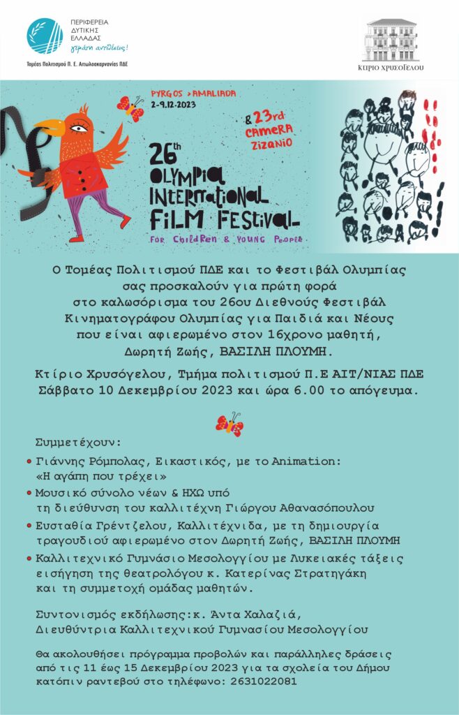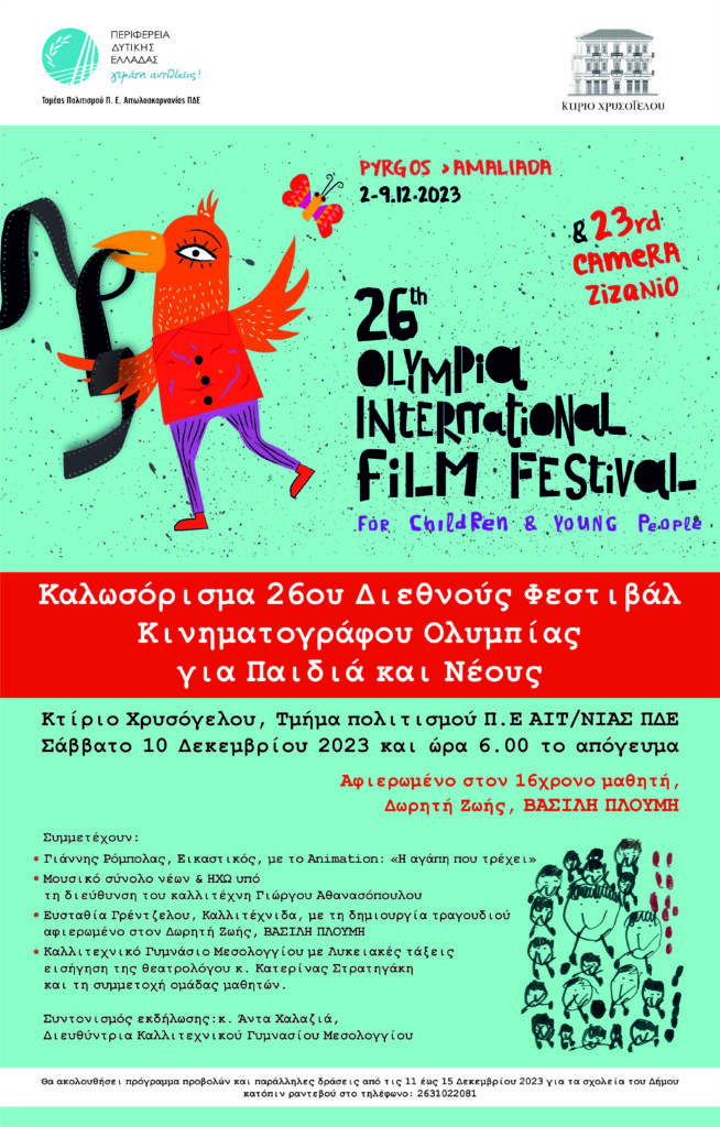 Ο Τομέας Πολιτισμού της ΠΔΕ και το Φεστιβάλ Ολυμπίας σας διοργανώνουν εκδήλωση για το καλωσόρισμα του 26ου Διεθνούς Φεστιβάλ Κινηματογράφου Ολυμπίας για Παιδιά και Νέους στο Κτίριο Χρυσόγελου, τμήμα πολιτισμού Π.Ε ΑΙΤΝΙΑΣ ΠΔΕ, στις 10 Δεκεμβρίου 2023 και ώρα 6.00 μ.μ.