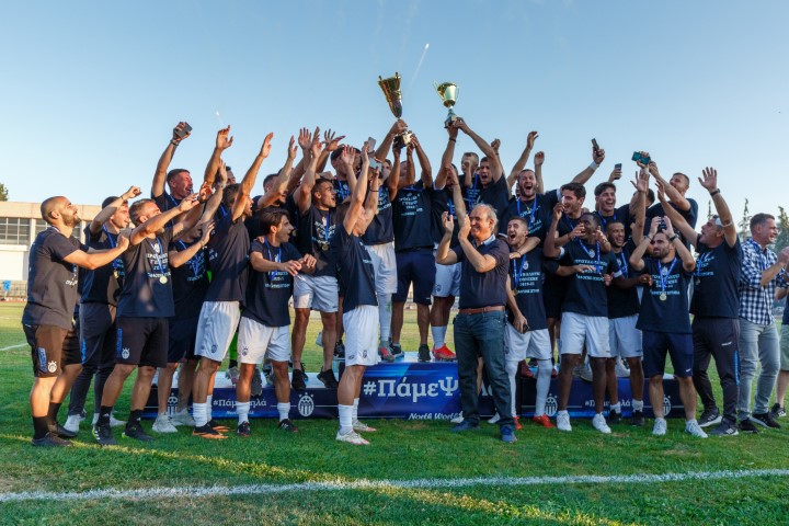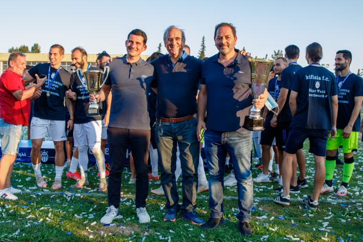 Ο πρόεδρος της Κηφισιάς, Χρήστος Πρίτσας, δεξιά στην φωτογραφία στη φιέστα ανόδου της ομάδας για πρώτη φορά στην ιστορία της στη Super League 2. (kifisiafc.gr)