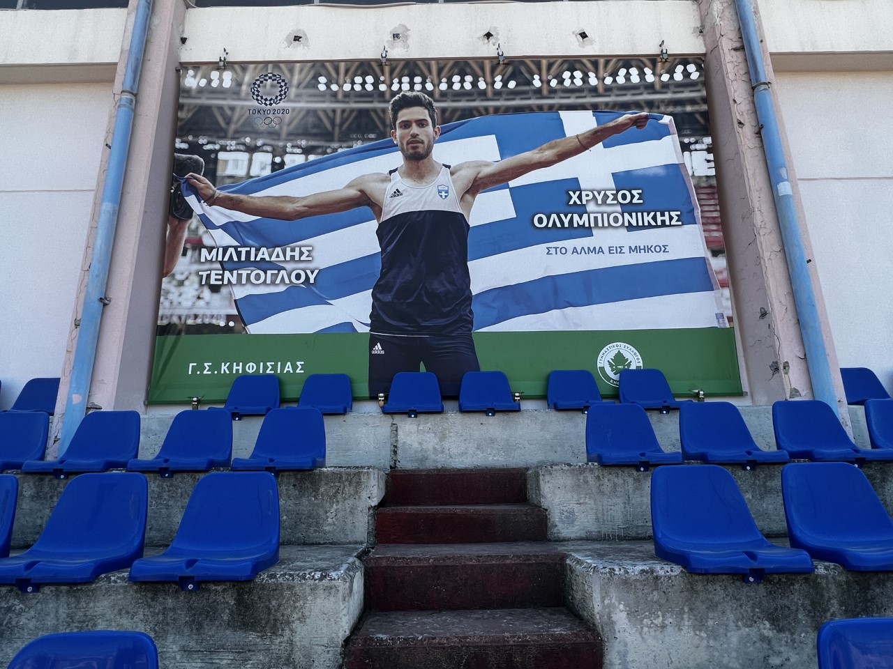 Η μεγάλη αφίσα του χρυσού Ολυμπιονίκη και αθλητή του Γ.Σ. Κηφισιάς, Μίλτου Τεντόγλου, κοσμεί το Ζηρίνειο.