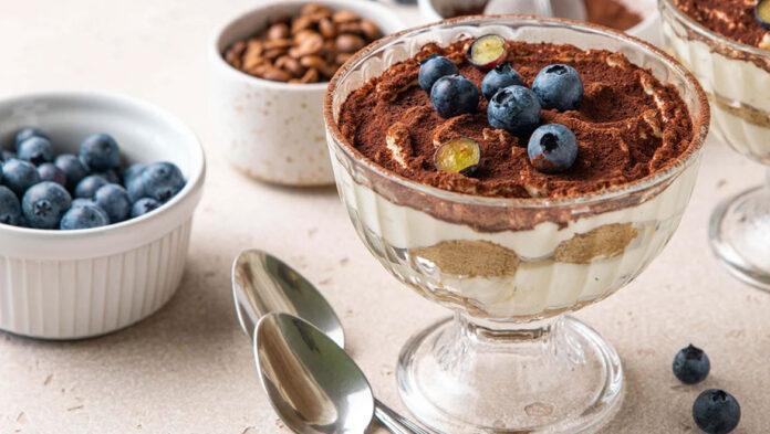 Κοσκινίστε με το κακάο και τοποθετήστε στο ψυγείο για τουλάχιστον 1 ώρα πριν το σερβίρισμα.