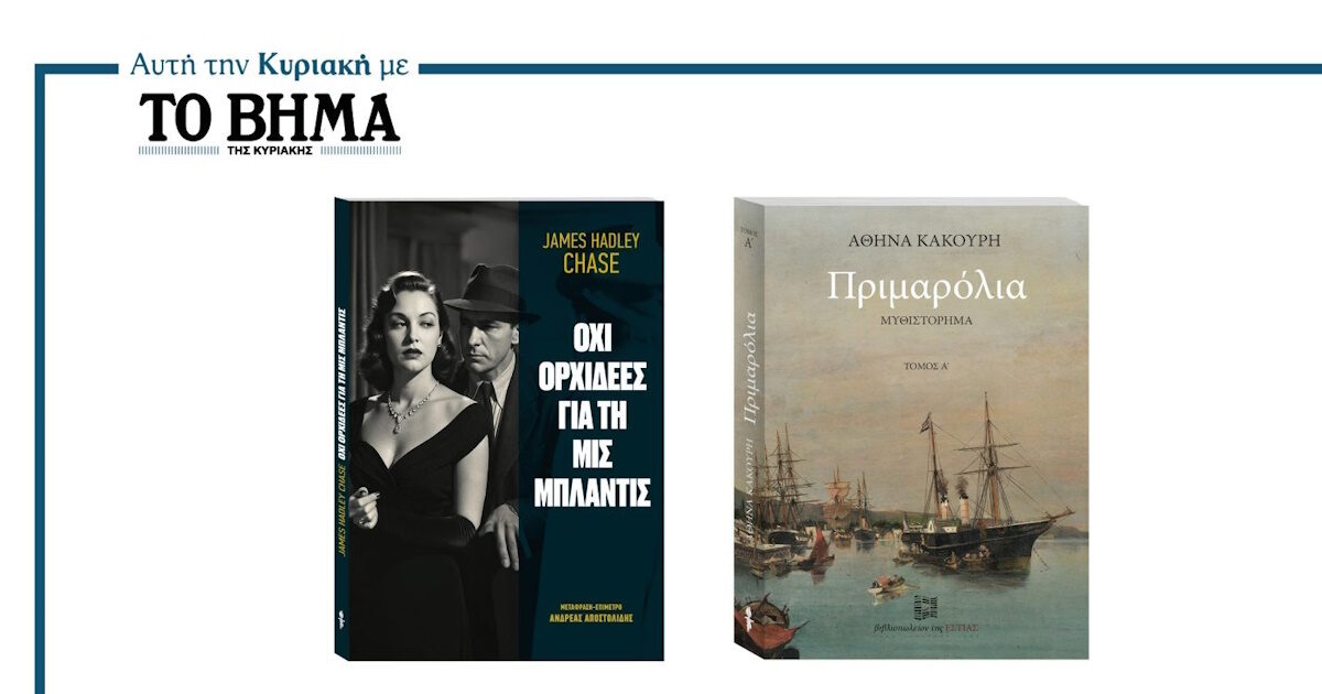 Πρόκειται για το αστυνομικό βιβλίο – θρύλος «Όχι Ορχιδέες για τη Μις Μπλάντις» του James Hadley Chase και το μυθιστόρημα εποχής της Αθηνάς Κακούρη «Πριμαρόλια» που κυκλοφορούν με το Βήμα της Κυριακής.