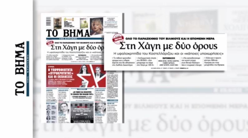 «Στη Χάγη με δύο όρους – Η υφαλοκρηπίδα του Καστελλόριζου και οι ‘κάποιες υποχωρήσεις’» αναφέρει το Βήμα στο πρωτοσέλιδό του, ενώ διπλωματικές πηγές σημειώνουν ότι δεν μπορεί να θεωρηθεί ότι η Ελλάδα στη Χάγη θα πάει για να κερδίσει 100-0.