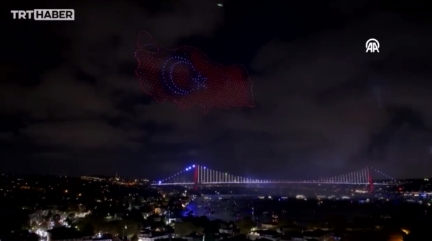 Χιλιάδες Τούρκοι παρακολούθησαν την γιορτή που στήθηκε την Κυριακή το βράδυ στον Βόσπορο, με την μεγαλύτερη νηοπομπή στην ιστορία της Τουρκικής Δημοκρατίας, για τα 100 χρόνια της Τουρκικής Δημοκρατίας, σε ένα σόου με πυροτεχνήματα, φώτα και drone.