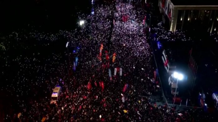 Για έκτη συνεχόμενη νύχτα μια λαοθάλασσα συγκεντρώνεται μπροστά από το Δημαρχείο της Κωνσταντινούπολης.