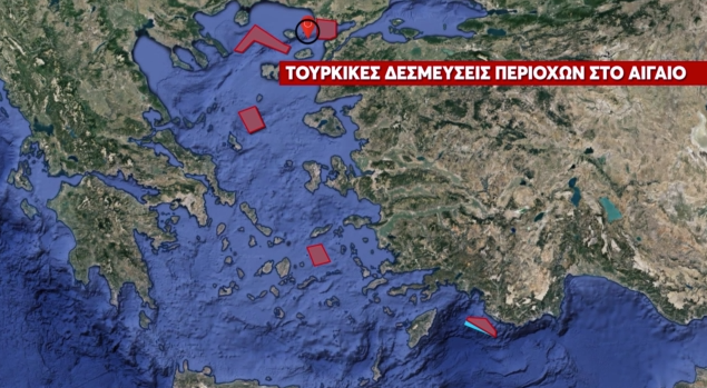 Οι περιοχές που έχουν δεσμεύσει για την στρατιωτική άσκηση είναι με τα κόκκινα σημεία στον χάρτη, και μάλιστα 3 από αυτές έχουν δεσμευθεί, όπως αναφέρει ο δημοσιογράφος Μαρίνος Γκασιάμης με παράνομη Navtex για έναν χρόνο.