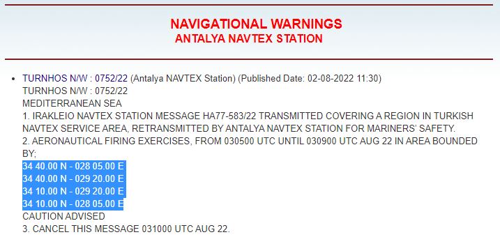 Η Τουρκία από την πλευρά της, μέσω NAVTEX που εκδόθηκε την τελευταία στιγμή από τον σταθμό της Αττάλειας, δέσμευσε θαλάσσια περιοχή στο ίδιο σημείο για δική της αεροναυτική άσκηση με πραγματικά πυρά για τις 3 Αυγούστου, αμφισβητώντας για ακόμη μια φορά τα όρια της θαλάσσιας δικαιοδοσίας της Ελλάδας.
