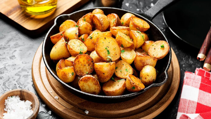 Ρίξτε πάνω στις πατάτες την παρμεζάνα, την τριμμένη φρυγανιά και δύο πρέζες ανθό αλατιού.
