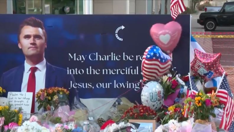 Έξω από τα κεντρικά γραφεία της πολιτικής οργάνωσης του Κερκ «Turning Point», στο Φοίνιξ της Αριζόνα, απλός κόσμος αφήνει λουλούδια και μπαλόνια με την αμερικανική σημαία στη μνήμη του.
