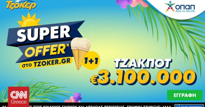 Σε καλοκαιρινή διάθεση το ΤΖΟΚΕΡ μοιράζει απόψε 3,1 εκατομμύρια ευρώ στην πρώτη κατηγορία. Όσοι επιλέξουν να καταθέσουν τα δελτία τους διαδικτυακά θα βρουν την προσφορά «Super Offer 1+1».