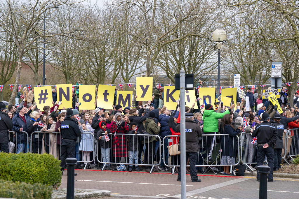 Στο Μίλτον Κέινς, ο βασιλιάς Κάρολος Γ’ αγνόησε τα σφυρίγματα αποδοκιμασίας και χαιρέτισε δια χειραψίας αρκετούς από τους παρευρισκόμενους, ορισμένοι από τους οποίους φώναζαν «God save the King» (O Θεός να σώζει τον Βασιλέα) προσπαθώντας να καταπνίξουν τις φωνές των αντιμοναρχικών.