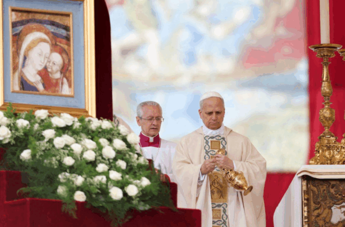 Ο Πάπας Λέων ο 14ος ανταλλάσσει χειραψίες με τον αντιπρόεδρο των Ηνωμένων Πολιτειών Τζέι Ντι Βανς και τον υπουργό Εξωτερικών στην κυβέρνηση Τραμπ Μάρκο Ρούμπιο.