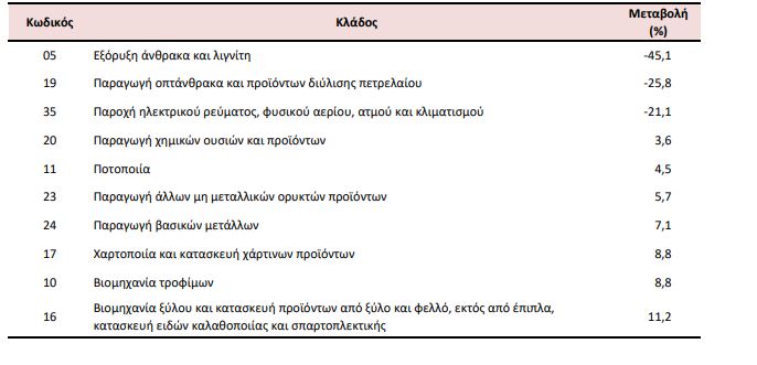 Ειδικότερα, στη μείωση αυτή συνέβαλαν κυρίως οι μεταβολές των δεικτών των διψήφιων κλάδων της ταξινόμησης NACE Αναθ. 2, ως εξής: