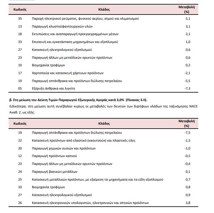 Ειδικότερα, στη μείωση αυτή συνέβαλαν κυρίως οι μεταβολές των δεικτών των διψήφιων κλάδων της ταξινόμησης NACE Αναθ. 2, ως εξής:
