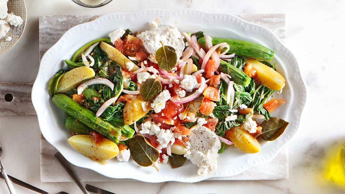 Μια θρεπτική συνταγή με κολοκυθάκια, βλήτα, πατάτες, ξινομυζήθρα και καψαλισμένες ντομάτες, σερβιρισμένη με αρωματικό λαδόξιδο ντομάτας.