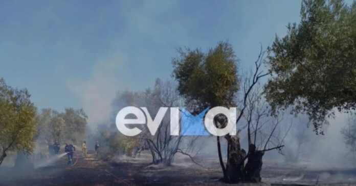 Η φωτιά στη Βόρεια Εύβοια, σύμφωνα με τοπικές πηγές, καίει ελαιόδεντρα και χαμηλή βλάστηση, με την κινητοποίηση της πυροσβεστικής να είναι μεγάλη.