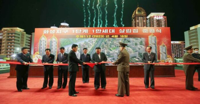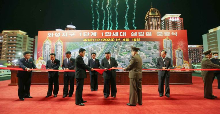 Ο «πεφωτισμένος» ηγέτης Κιμ Γιονγκ Ουν κόβει την κορδέλα εγκαινιάζοντας 10.000 νεόδμητες κατοικίες στο πρόγραμμα με τον πομπώδη τίτλο «ο πολυτελής δρόμος του σοσιαλισμού γεμάτος ανθρώπινη ευτυχία».