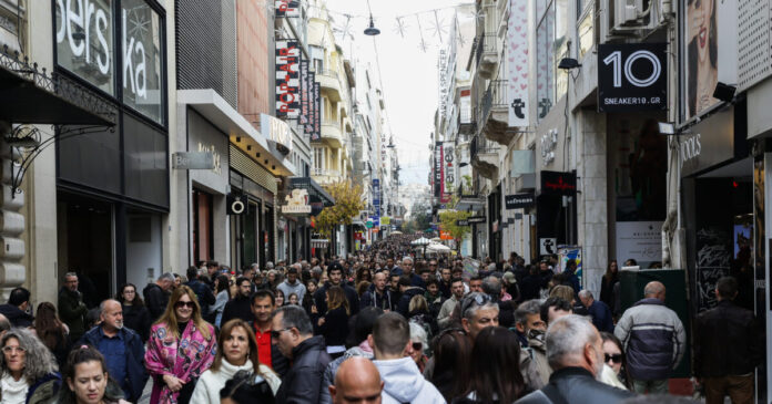 Κοσμοσυρροή στην Ερμού, από νωρίς το πρωί της Κυριακής (21.12.2025). Οι Αθηναίοι ξεχύθηκαν στον πιο εμπορικό δρόμο της Αθήνας μιας και σήμερα τα καταστήματα είναι ανοιχτά.