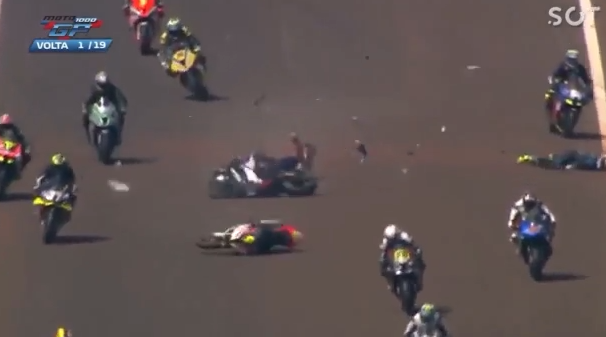 Ο 42χρονος αναβάτης έχασε τον έλεγχο της μοτοσικλέτας του στην πρώτη στροφή του αγώνα και κατέληξε στο κέντρο της πίστας με τους αντίπαλους οδηγούς να προσπαθούν να τον αποφύγουν.